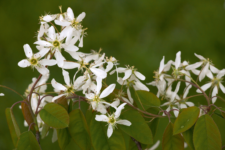 An American shrub naturalised in woodlands in a few areas of the south of England, notably on sandy soils in Sussex. Up to 10 m (33 ft) high. Leaves alternate, oblong. Drifts of white blossom in April and May. Fruit purplish-red/black, 10 mm (½ inch) with withered sepals, in June.