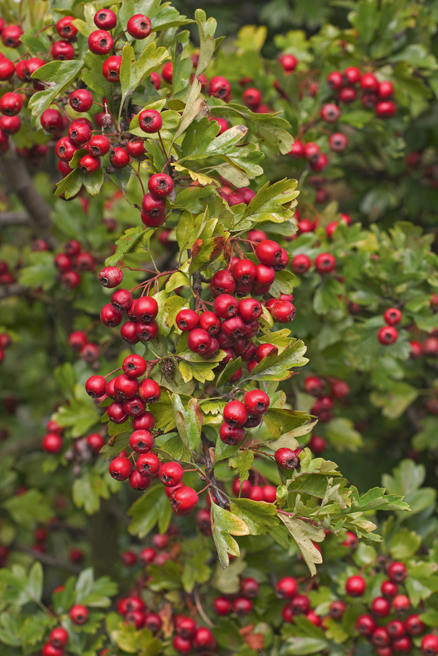 Widespread and abundant on heaths, downs, hedges, scrubland, light woods and all open land. Small tree or large shrub, up to 6 m (20 ft) high. Leaves glossy green and deeply lobed on spiny branches. Flowers: May to June, abundant umbels of white (sometimes pink) strongly scented blossoms. Fruit: small round dark red berries, in bunches.