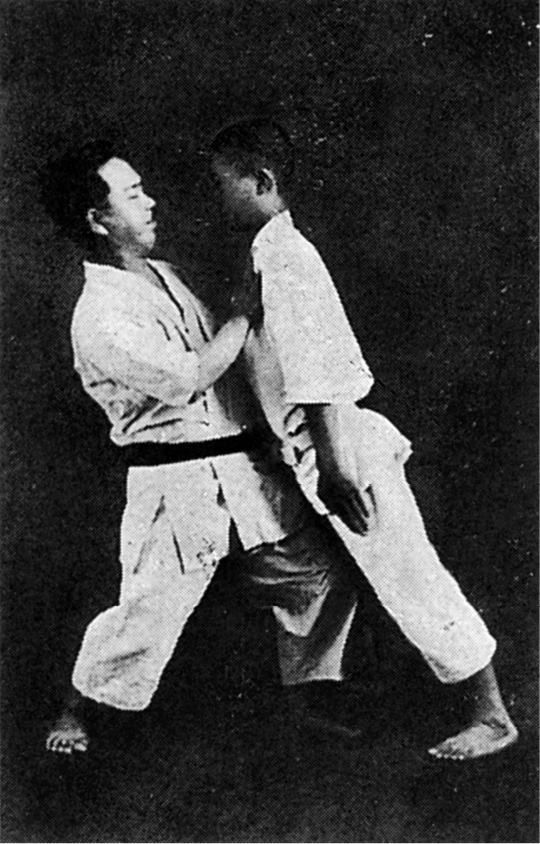 There is a special Japanese budō exercise called “falling tree” (tōboku hō) or “falling down” (tōchi hō). In the book cited above The Secrets of Okinawan Karate by master Arakaki there is a photo showing me doing this exercise. The photo has been taken from the book my father published in 1938, Introduction into Attack and Defense Techniques in Karate Kempō. It shows how my father is supporting or catching me, respectively. This exercise gives the experience of a tree falling down to earth using the energy of the free fall. The body does not try to resist gravity. Arakaki considers this exercise, which is peculiar to the Japanese budō, to be the top level of human body control. My understanding of this practice is not that much scientific and I like to use the name used in the Itosu style: “borrowing power from the earth”.