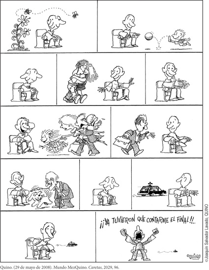 Hablar aquí de «texto» es aludir a la organización planaria y lineal, bidimensional a final de cuentas, de los elementos concretos que permiten expresar la significación del discurso y crear así las condiciones para dar forma a un conjunto significante. Así, en doce viñetas ordenadas con el canon sintagmático [izquierda-derecha; arriba-abajo], Quino relata una breve historia, con mucho de alegoría existencial, sobre el transcurrir de la vida y la llegada de la muerte.