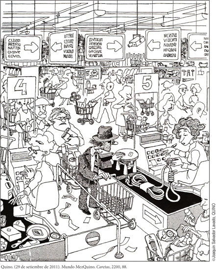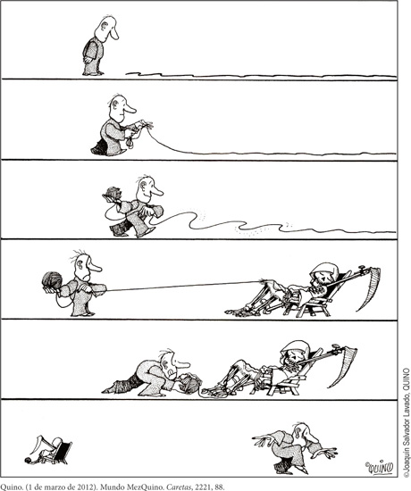 Llegamos al punto: el carácter irrisorio de esa práctica extensa en el tiempo, repetitiva, persistente, colectiva, que es la costumbre, la cual agita el cuerpo-cavidad hasta el cansancio supremo. Uno, aturdido, deja de ser actor y se convierte en cuerpo-punto observador, toma distancia, se siente extraño y extrañado, exiliado irremediablemente. Se sale de sí mismo. Una vez que se ha salido de sí hacia lo otro, convierte su inveterada costumbre de vivir en objeto de risa, antes de proceder a exterminarse. «Tal divorcio entre el hombre y su vida, entre el actor y su decoración, es propiamente el sentimiento de lo absurdo» (Camus, 1973, pp. 15-16). Y Quino sabe «pintar» ese divorcio con decoraciones mudas y abigarradas como las pinturas desconcertantemente raras de la gruta arriba referida. Sabe salirse del que se sale de sí y poner ahí a un espectador. Sabe hacer más irrisorio aquello que ha sido desencadenado por lo irrisorio que la carne misma de la caricatura esconde. En sus «cuadros», se presupone esa íntima vivencia de absurdo que embarga al protagonista y que, más allá de oscuridades y de contradicciones inexpresables, rige su curso existencial de virtual suicida.