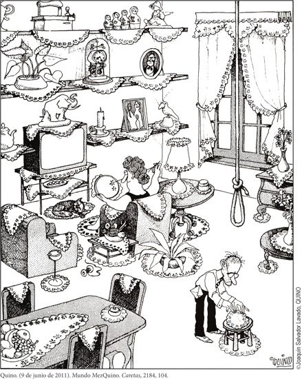 Contraponemos esa cuidada pulcritud al sucio descuido de un suicida, realizado en Quino (2015, p. 39; véase la historieta en el anexo 7). Cuatro viñetas: la mujer llega tranquila a la puerta de su departamento. La abre, mira hacia lo alto con los ojos muy abiertos, hay una silla volcada en el piso. Se acerca a la silla y la mira horrorizada jalándose los pelos con la mano izquierda y mordiéndose la derecha. Señalando las huellas de zapatos en la silla, llama la atención al suicida, quien, en terno, cuelga de la supuesta soga: el espectador no ve la cabeza del suicida, pero sí ve la famosa «carta al juez» aún en su mano izquierda. En la axiología de la protagonista, la limpieza material del objeto tiene más valor que la ausencia de vida del sujeto: su supuesto marido. Regaña al finado por haber ensuciado el tapiz de la silla. La sombra del cadáver se proyecta sobre su rostro.