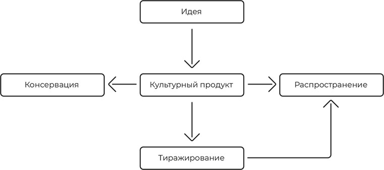Следующий этап – создание продукта, когда проходят репетиции, создаются костюмы, декорации, происходят съёмки, монтаж материала и т. д. – об этом мы будем говорить в главах «Производство» и «Аудиовизуальные продукты». Сейчас надо понять, что у всех культурных продуктов будет одна схема реализации задуманного. Процессы производства будут отличаться.