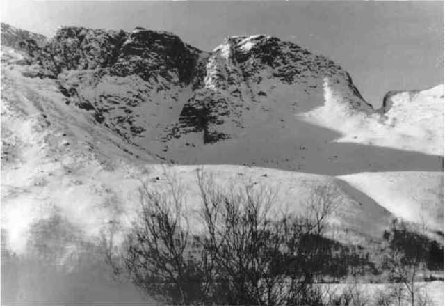 Косой глубокий шрам, рассекающий Вудъяврчорр снизу доверху, называется Лавинным кулуаром. Небольшая зазубрина справа, словно кто-то тюкнул по горам топориком – перевал Географов