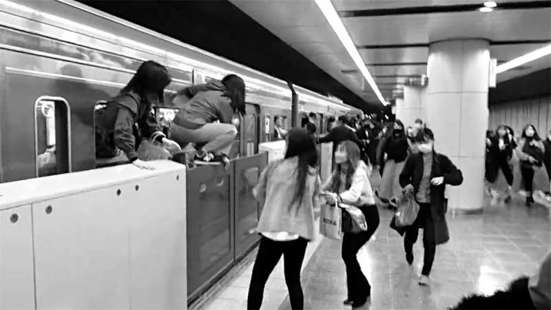 Пассажиры спасаются из горящего поезда через окна. Снимок сделан 31 октября 2021 года в Тёфу, Токио