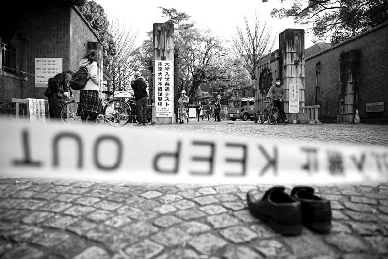 Полиция осматривает место, где произошли нападения с ножом, у входа в кампус Токийского университета