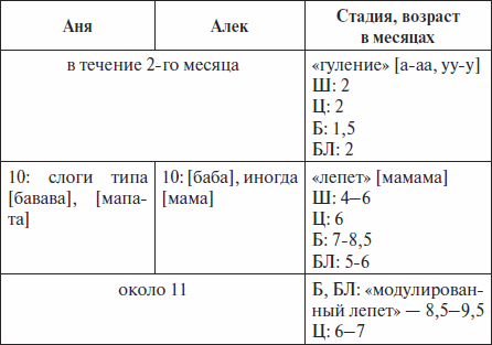 И всё же: если русский специалист связывает первые слова с возрастом от 9,5 месяцев, американский решительно говорит о том, что первые слова дети произносят после года. При этом особо подчёркивает: «считается, что в течение первых 10–13 месяцев жизни дети находятся в долингвистической фазе языкового развития» (Шеффер; 518). Родители двуязычных детей, говорящих на английском, кажется, могут сделать «практический вывод»: можно позволить себе расслабиться, можно обождать ещё пару месяцев с напряжённым ожиданием первого слова, со страхами из-за «позднего начала» говорения…