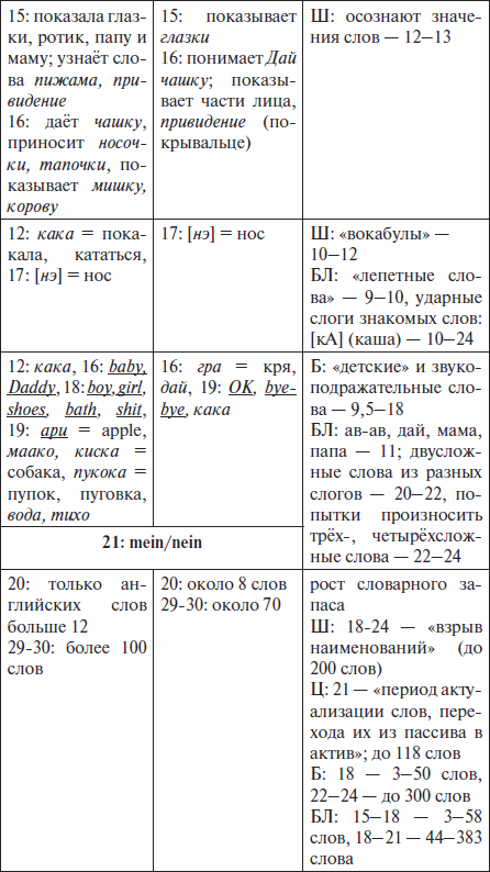 Здесь и далее в таблицах слова разных языков обозначены – чтобы сразу бросались в глаза – по-разному: русское, английское, немецкое. Цифры означают возраст в месяцах.