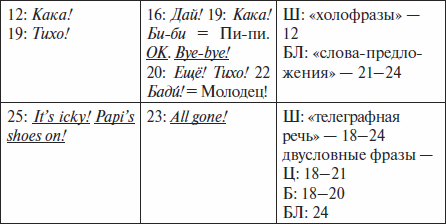 Ниже – таблица, позволяющая сравнить развитие речи наших детей – и «типичного» одноязычного ребёнка.