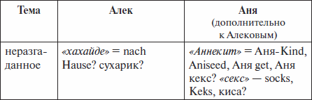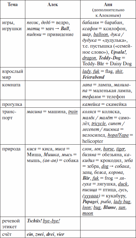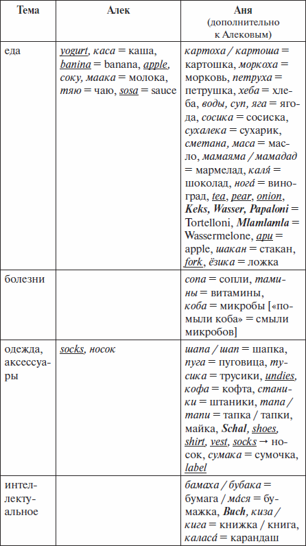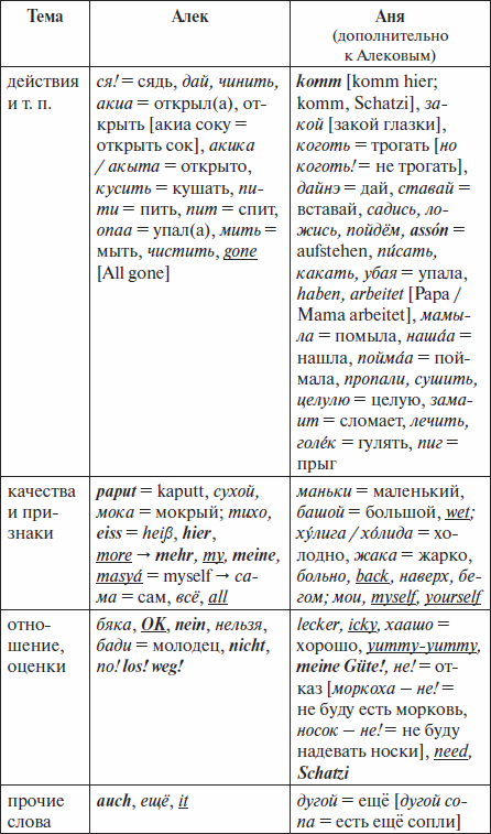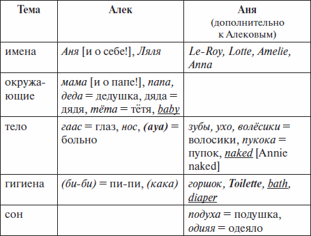 Для экономии места в «Анином» столбце приведены только те слова, которые в этом возрасте умела говорить исключительно она (то есть это лексика СВЕРХ того словарного запаса, которым в 2,5 года владел Алек).