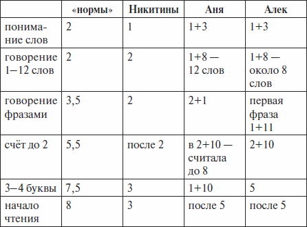 Лена Алексеевна и Борис Павлович Никитины, пионеры идеи «раннего развития» в России, однажды составили схему «опережающего развития» своих детей (Никитины Б. П. и Л. А. Мы, наши дети и внуки. М.,1989.) («Нормы», которые в этой таблице приводятся, взяты, правда, из русских официальных документов середины 60-х годов.) Вот эта схема, в виде таблички и с добавлением наших успехов (в русском языке). Цифры означают возраст: количество лет.