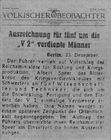 Орган нацистской партии газета «Фёлькишер беобахтер» сообщила о награждении конструкторов «Фау», утаив их имена.