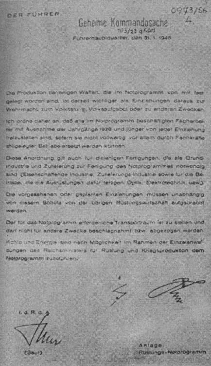 Подписанный Гитлером секретный приказ, предписывающий обеспечить бесперебойное производство вооружения, в том числе ракетного оружия.