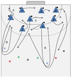 - In each corridor, there are 2 defending players and three attacking players alternately (two attacking players are sufficient in the first corridor).