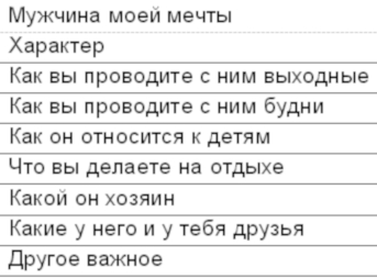 Заполни эту форму вдумчиво. Опиши, какой он должен быть. Не нужен цвет волос, возраст, вес, профессия. Спокойно сядь и помечтай, какой он ДЛЯ ТЕБЯ – как вы проводите будни, как проводите вместе праздники, будешь ли ты ему готовить, как ты будешь заботиться о нем, а он о тебе. Как он будет к тебе относиться, когда ты будешь беременна, как вы будете воспитывать детей. Как вы будете отдыхать, куда поедете. Будет ли он что-то делать по хозяйству. От этих данных будет зависеть, где ты будешь искать своего избранника – в кружках моделистов, в книжном магазине или в банке. Раз в месяц нужно перечитывать описание своего идеального мужчины. Дополняй нужное и вычеркивай ненужное. После свиданий с другими мужчинами у тебя обновится представление о будущем муже, это тоже необходимо зафиксировать. Позволь своей мечте быть безграничной!