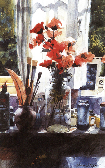 The centrepiece of this studio still life is a bunch of poppies thrust into a glass jar. The flowers are artificial, yet the looseness in the way in which they were painted gives them a vitality that was missing in the subject. I allowed the colours to ‘bleed’ here and there and created a wide range of tones from pale tints to warm blacks.