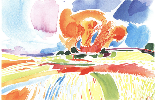 I repainted Autumn Tree 1 using the complementary colours. This resulted in some exciting surprises – blue tree, orange sky, red fields!