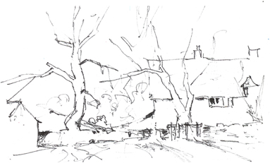 Racing home, we rounded the bend. Suddenly, before us was the most lovely subject for a painting. We quickly parked. Time was limited, so out with the sketchbook, and I made a hasty study in pencil with just the essential details – a little tonal shading and a few colour notes. I took a photograph and jumped back in the car and we carried on with our journey.