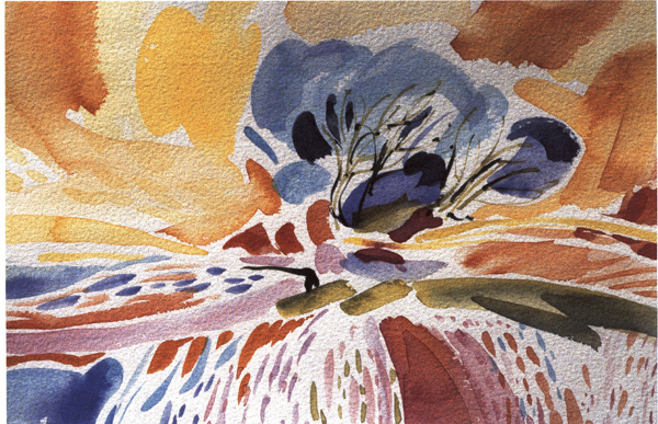 This small painting was started with a variegated wash onto damp paper. This encouraged colours to flow together in a clean and spontaneous way. After allowing this first wash to dry, other washes were laid on top to suggest mountain and wave forms. The white highlights were scratched out with a sharp blade.