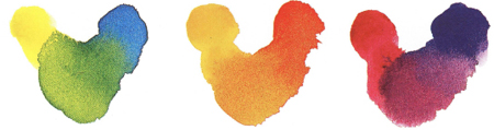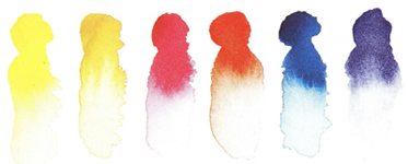 (left to right): Lemon Yellow (yellow and blue); Cadmium Yellow (yellow and red); Permanent Rose (red and blue); Cadmium Red (red and yellow); Phthalo Blue (blue and yellow); French Ultramarine (blue and red).