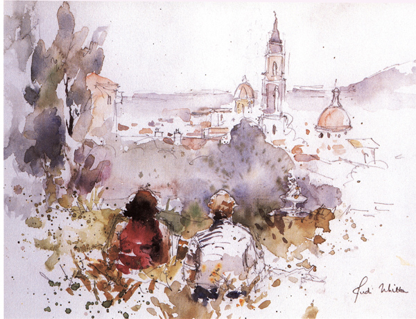 In Sarah and Barbara Painting Florence on my sketchbook was invaluable. I was painting in Italy with my friends. After problems with onlookers I had tucked myself away in a quiet spot. We were in the Boboli Gardens overlooking Florence and the weather was showery. My friends settled down on the grass. They were much farther apart than shown in the painting and I used the sketchbook to bring them closer together and to position them sympathetically with the panorama in front of us. I had originally intended to concentrate on the wonderful view of Florence, but I could soon see from my sketch that my friends were the most important part of the painting! In addition to this the sketch also became my insurance policy in case my friends moved position, or the threatening rains arrived.