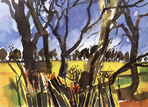 Having got the composition and paper size right, think about some technical details, such as choosing a suitable brush. I frequently have to suggest to students that they should try using a larger brush. How can a fresh, exciting painting be made by fiddling away with a very small sable? It’s impossible. Sable brushes are expensive, but you do not have to use these. Ranges of excellent synthetic brushes are available. You could also experiment with decorator’s brushes.
