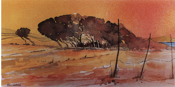 It was a dull, rainy day. I sketched from the car and there was little tonal contrast. It all seemed very unpromising but my sketch (right) became a challenge. I tried to compensate for the narrow tonal range and emphasized any local colour. Above all, I stopped while the painting still had the ‘sketchbook feeling’.