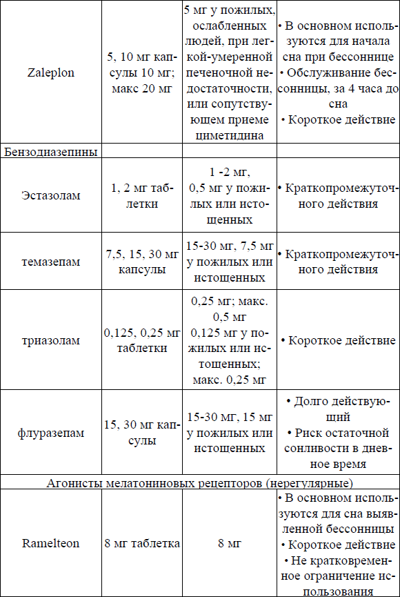 Zaleplon и Ramelteon имеют очень короткий период полураспада и, следовательно, могут уменьшить латентность сна, но мало влияют на пробуждение после начала сна; они также редко приводят к остаточной седации [Sateia MJ, 2017].