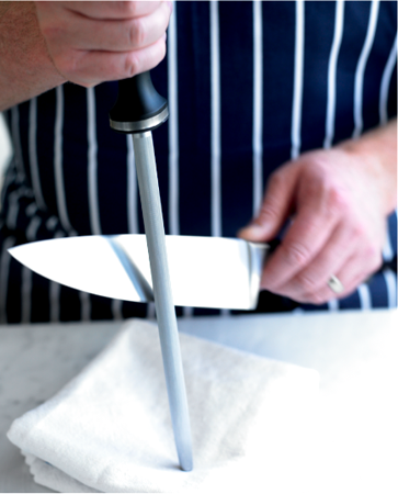 An essential accessory for keeping your knives sharp. Hold the steel vertically, either pressed on to a tea towel on a flat surface as shown below, or, when you feel more confident, held freely at arm’s length in front of you. Slide the knife blade down the steel, at an angle, then again down the opposite side of the steel. Repeat about six times on each side until the knife is sharp – your cutting edge is now ready for work.