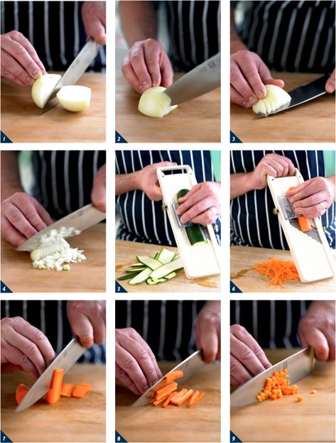 Peel the onion and chop off the root and tip. (If you’re less confident, you can leave the root attached until the last minute to hold the pieces securely together. But don’t forget to remove it before cooking!) Cut the onion in half through the root end (see the step by step pictures over the page). Place one half of the onion flat-side down on the chopping board. » Make about six parallel cuts downwards with the knife tip pointing towards the root end, but cutting short of the root end so that the onion continues to hold together.