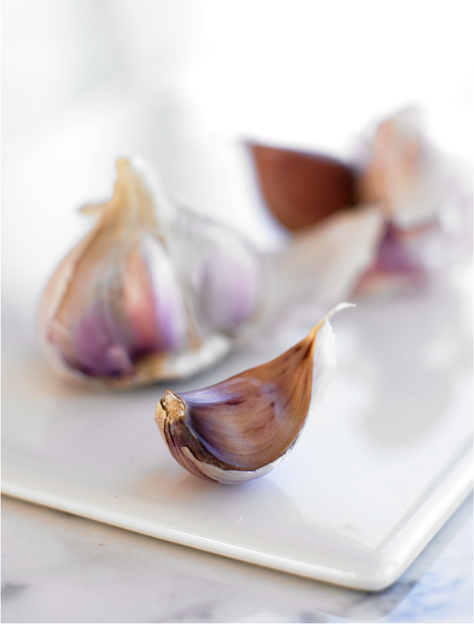 Cut the root end off the clove of garlic. Lay the clove flat on the chopping board and rest the blade of a large knife horizontally on it. Lean heavily on the flat blade with the heel of your hand. The garlic clove will crack under the weight and will simultaneously be released from its papery skin. Remove any green stalk from the centre and finely chop using a rocking motion.