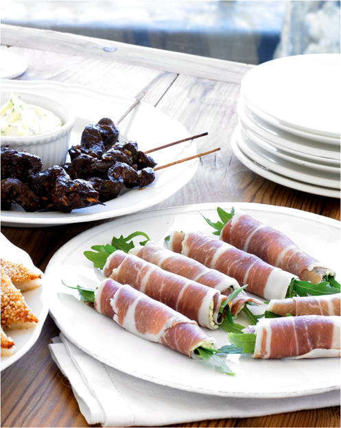 Shown on page 59, these are very simple but look and taste quite special. They can be made an hour in advance and kept in the fridge until you are ready to eat them. When cutting the Parma ham, don’t worry if each slice is not perfect, you can neaten them up as you roll them. A great alternative to Parma ham is bresaola – very thin slices of air-dried, salted beef.