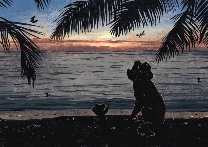 Внезапно джунгли словно ожили. Как взрывная волна стал нарастать невероятной силы шум. Казалось, тысячи скрипок, сотни тысяч виолончелей и миллионы других инструментов заиграли в полную силу одновременно. Все вокруг стрекотало, клокотало, звенело, жужжало. Эхом прокатилась эти странная симфония над пляжем. Звук был такой силы, что, казалось, попытайся Жу и Кэп поговорить друг с другом, им пришлось бы кричать. Это маленькие жители джунглей – жуки, пауки, муравьи и кузнечики – приветствовали солнце своей песней. От этого звука проснулся Кейптаун, сел на песке и потер маленькими лапками сонные глаза.