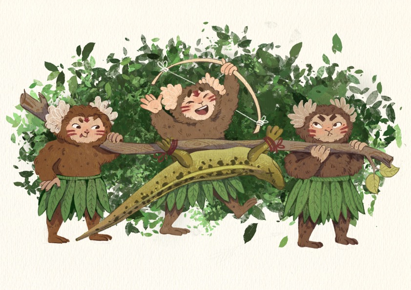 Жу чуть не помер со смеху, потому что в его понятии охота – это как минимум на гепарда, и уж точно не на ящериц, которых он мог придавить одной лапой. Но игрунки – обезьянки маленькие, и для них большая сочная ящерица – вполне себе обед! Однако, чтобы накормить все племя, нужно ящериц десять, поэтому остальные члены племени продолжили охоту. Жуневьер быстро сообразил, что, благодаря своим размеру и силе, он с легкостью наловит ящериц без лука и стрел, просто прыгая на них в нужный момент и придавливая мощной лапой, и уже через час у племени было целых пятнадцать ящериц.