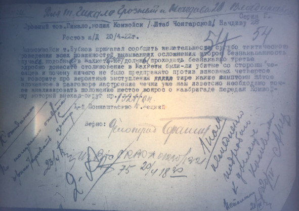 Комвойск СКВО тов. Ворошилову. От товарища Гикало получено следующее: Зам. Комвойск СКВО т. Буденому копия Юго- Восток РГРО П. К. Прошу без ответственности бандитских выступлений порочного элемента аулов Чечни не выловленных в горах скрывающих их белогвардейцев провокации сильного бандитизма Тергубернии, на границах Чечни и его влияния помимо причин социального экономического характера- почва безответственности бандитизма джигитовства за 21- 22 год углублялась не встречая организованного сопротивления. Бандитизм прошлого со стороны горцев своих проявлениях касался только русско- казачьего населения – бандитизм настоящего вышел из рамок национальных бытовых устоев перейдя на разбой убийство и горцев частности чеченцев. Горское население теперь одинаково страдает от бандитизма с русскими. Чеченцы сами бороться силу неизжитых обычаев родных связей не могут, меры же осторожные, вдуманные вызывают в массе чеченцев только оздоровления и симпатии Соввласти. В силу тех устоев горской деревни помогающих скрываться бандитам мы опасаемся, что наши активные мероприятия против порочного / этого элемента могут встретить поддержку со стороны населения. Данное положение заставляет нас расценивать частичные операции как меры которые могут перейти в столкновение с рядом близ лежащих аулов. Это исторически фактически было так. Такое же положение сел. Махкету аул Махкеты убиты нашей стороны 4/ 244 полка 11- кр- цев, чеченец начальник районной милиции сын Зелемхана (?) как сотрудника грозполитотдела. Чеченцев Махкеты убито три. Наказать виновных вызывает необходимость. Сконцентрировать полка две пехоты и резерв. Шали в итоге результата не будет событием подобию Махкетинскому, Катыр- юртовскому проходят без быстрого наказания причины неподготовленности численности в данном районе неподготовленность- отсутствие обозов для продуктов орудий огнеприпасов отсутствие обоза ложится всей тяжести на население то время когда есть декрет о прекращении гужповинности. Повинности проводятся при наличии соблюдения тактической осторожности, но мы имеем наличие дорог, болезненное самолюбие горцев разжигаемое безответственным настроением провокациям симптомы выступления: 1. Организация кулачества, шариатские полки. 2. Усиливается наглый бандитизм. 3.Захват почти посевкома кулацкими властями. 4. Земельная внутри надельная неразбериха захватом лучшей и большей земли зажиточным населением. 5. Убийство красноармейцев. 6. Голод местами горной полосы. 7. Неисполнение распоряжений Соввласти и вызывающее поведение кулаков. Указанные симптомы наиболее яркие. Настоящая оценка дополнение ранее посланной Юговостбюро я Вам. Николай Гикало.