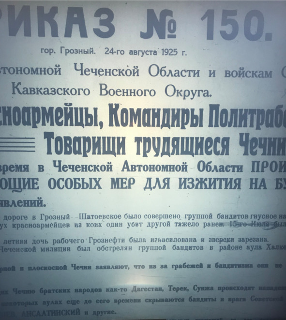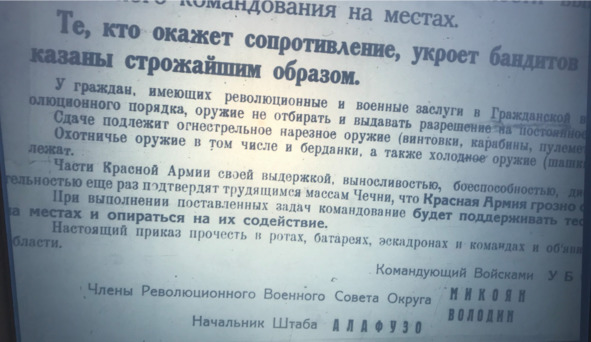 Протокол Политбюро №79 от 17 сентября 1925 года. Пункт 2: О Чечне, Ингушетии и Дагестане (Уншилхт, Ягода; Политбюро от 23.7.1925, протокол №72, п. 17) – ОП. Решено: а) Распространить операцию разоружения на Ингушетию, возложить проведение операции на войска ОГПУ и Военного ведомства, провести операцию на тех же основах, что и в Чечне. б) Поручить Калинину вызвать в Москву членов ЦИК и ЧечЦИК, принимавших участие в антисоветских действиях, и принять соответствующие меры. в) Предоставить ОГПУ право разрешения вопроса о применении высшей меры наказания по соглашению с местными органами.