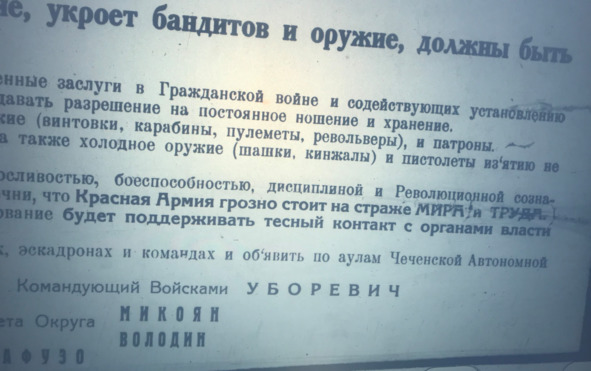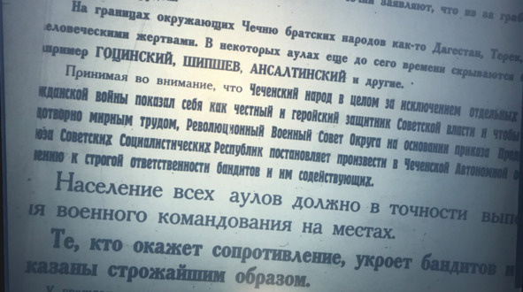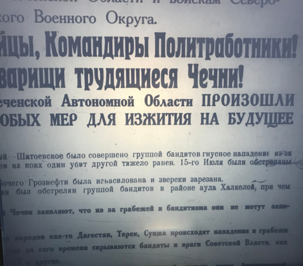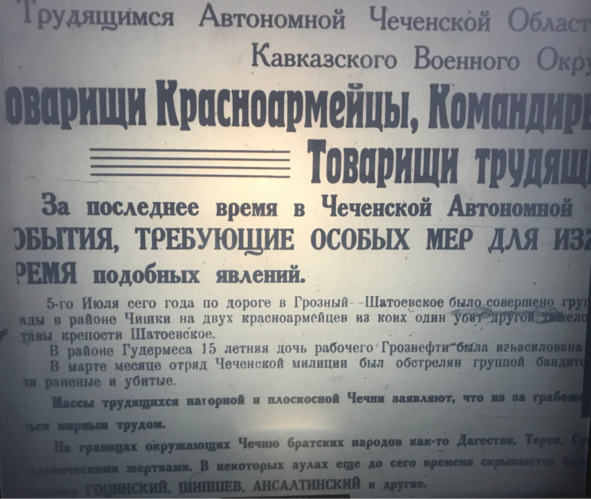 Галанчожский район. По донесению уполномоченного т. Глыба основным моментом, определяющим настроение в районе сейчас является упорный «хабар» о ней войне Соввласти с 7-мью иностранными государствами. Неизвестно кем распространяются слухи об укреплении городов Грозного и Владикавказа, призыве добровольцев и формировании национальных частей во Владикавказе часто упоминание о последнем объясняется тем, что Галанчожский район экономически гораздо больше связан с Ингушетией, чем с плоскостными районами Чечни), которые должны отправиться на фронт что подходит чуть ли не к Баку и Ростову. Интерес к хабару о войне носит значительные размеры. Слухи комментируются по разному; большинство стоит на той точке зрения, что Соввласть не выдержит. Отдельные отголоски этого хабара поговаривают даже о выступлении против Соввласти, как только будет известно, что фронт у Баку и Ростова. По сообщениям кунаков и информаторов, все эти слухи заносятся с плоскость Урус-Мартановскими спекулянтами, обменивающие здесь на скот разного рода фабрикаты, отчасти идут с Ингушетии и особенно раздуваются скрывающимися кабардинцами во главе с Шипшевым. Общее отношение к слухам несколько безразличное, но царит общая уверенность о событиях, которые должны разыграться.