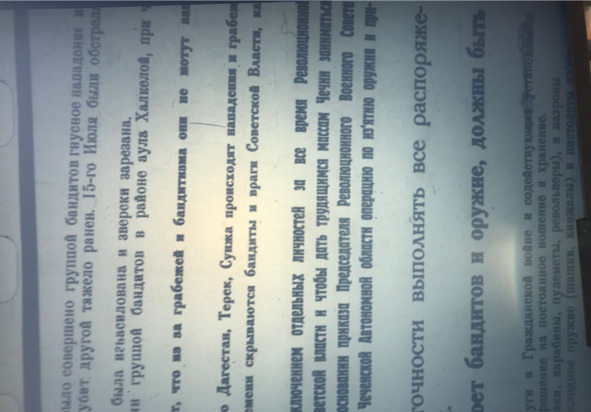 Главарь бандитских организаций в Ингушетии, Кабардино-Балкарской и Осетинской Т.-Х. Шипшев, также в течении трех этих отчетных м-цев, после грабежей возвращается в Чечобласть, в Урус-Мартанский район. Бандиты с награбленным возвращаются в свои аулы и открыто продают награбленное на базарах. В период июня м-ца особенно замечалась оживленная торговля оружием на базарах в Веденском и Урус-Мартановском округах. Русская кавказская винтовка расценивается в 12 рублей, пехотная в 10 рублей, револьверы «наган» – 15—25 рублей, «Маузер» – 50—70 рублей, патроны винтовочные 35 копеек штука, револьверные – 50 копеек.