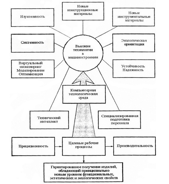 Высокими (ВТ) следует считать такие технологии, которые обладая совокупностью основных признаков – наукоемкость, системность, физическое и математическое моделирование с целью структурно-параметрической оптимизации, высокоэффективный рабочий процесс размерной обработки, компьютерная технологическая среда и автоматизация всех этапов разработки и реализации, устойчивость и надежность, экологическая чистота, – при соответствующем техническом и кадровом обеспечении (прецизионное оборудование, оснастка и инструмент, определенный характер рабочей технологической среды, система диагностики, компьютерная сеть управления и специализированная подготовка персонала), гарантируют получение изделий, обладающих новым уровнем функциональных, эстетических и экологических свойств.