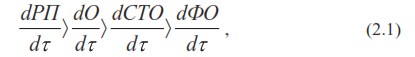 Здесь каждое отношение составляет скорость разработки со ответственно РП – рабочих процессов, О – оборудования, СТО – систем технологического обеспечения, ФО – форм организации технологического процесса, r – время.