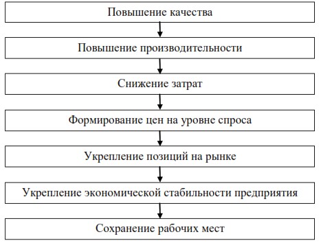 «Цепная реакция». Цель раздела – показать руководству и персоналу предприятия взаимосвязь качества труда, эффективности производства и стабильности положения работников предприятия. Эта взаимосвязь представлена в виде диаграммы (рис. 4.2), в которой показано, что повышение качества в конечном счете приводит к сохранению рабочих мест, что улучшает мотивацию работников и, в свою очередь, приводит к дальнейшему повышению качества.