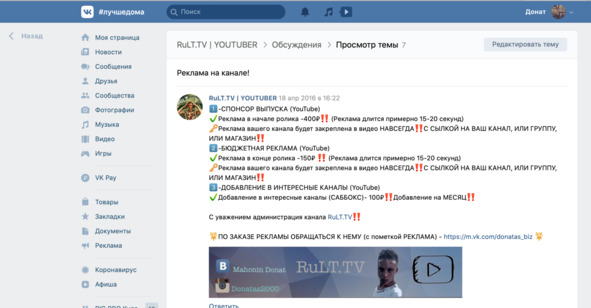 Именно такой контент мне нравилось снимать больше всего, к слову, просмотры сразу взлетели, и начал продавать первую рекламу, стоимость была всего 100 рублей!
