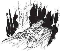 “Right!” he said aloud. “I remember now! I am the Captain! Well, if I’m the Captain I should be up and doing, not lying around in the dark.” And, flattening himself, he began sliding out from under those glassy teeth. To his amazement, he felt, as he wriggled and slid, that he was much lighter than he had somehow imagined he would be. Indeed, it was as if he weighed nothing at all. This unexpected lightness unbalanced him. He wobbled! He swung one arm into the air. Immediately, the longest tooth of ice plunged greedily into it. The Captain screwed up his eyes, expecting blood and pain, but there was no blood, and no pain either. He lowered his arm and the glassy tooth slid out of it without leaving a single mark even on the sleeve of his heavy jacket. Flattening himself once more, he wriggled out from under the toothy icicles, swung his legs sideways, stood up carefully and looked out into the darkness.