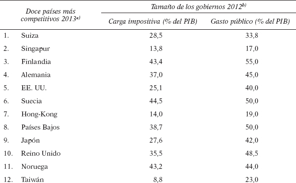 El cuadro 2.1 aporta más argumentos sobre la falsedad de la dicotomía en cuestión. En él se cruza la lista de los 12 países clasificados por el World Economic Forum (WEF) como los más competitivos del mundo en 2013, con datos correspondientes al tamaño de los gobiernos en cada uno de ellos, en 2012, tomados del Índice de Libertad Económica que anualmente publican conjuntamente La Heritage Foundation (HF) y el Wall Street Journal (WSJ).