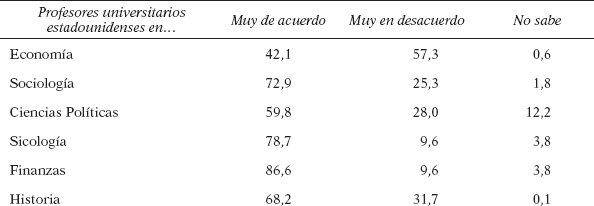 A continuación, en el mismo artículo, se resumen los datos de una encuesta de 2006 a una muestra conformada por 100 profesores universitarios estadounidenses en cada una de las disciplinas que aparecen en el cuadro 2.2. El enunciado sobre el cual se recogieron los pronunciamientos fue: “En general, el conocimiento interdisciplinario es mejor que el conocimiento obtenido en una sola disciplina” y, como se puede ver en las respuestas, mientras en todas las otras disciplinas los encuestados estuvieron apabullantemente a favor (desde un 59,8 % entre los científicos políticos a un 86 % entre los dedicados a la enseñanza de las finanzas) solo los profesores de Economía estuvieron mayoritariamente en contra (57,3 %).
