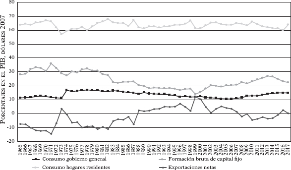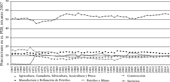 GRÁFICO 3.7. Importancia relativa de las industrias, 1965-2017 (porcentajes en el PIB dólares 2007)