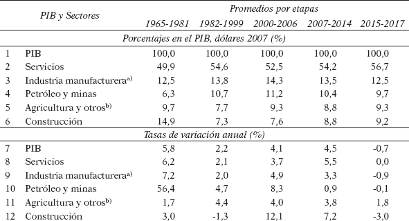 •La estructura general y, en particular, el recorrido de cada una de las actividades económicas, con excepción de la construcción, son notoriamente estables: la participación de los servicios se mantiene en un promedio del 53,5 %, con una desviación estándar del 2,4 %; el promedio para la industria manufacturera es del 14,3 %, con una desviación estándar del 1,9 %; en el caso de petróleo y minas, el promedio es del 9,7 % y su desviación estándar 2,0 %, y para la agricultura el promedio es del 8,9 % y su desviación estándar el 0,8 %. Con la construcción, el promedio es del 9,6 %, con el 3,1 % la desviación estándar es la más alta de todas. En síntesis, no deja de llamar la atención que a lo largo de un período de prácticamente medio siglo no se hayan dado cambios estructurales propios de procesos de desarrollo económico viables.