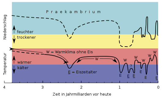 Abb. 6: Rekonstruktion des mittleren Temperatur- und Niederschlagsverlaufs der Erde seit 3,8 Milliarden Jahren. E = Eiszeitalter; E = Eiszeitalter mit Eisbildungen an beiden Polen; W = eisfreies Warmklima. (14)