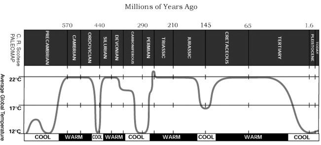 Abb. 7: Das Auftreten von Kalt- und Warmzeiten mit ca. 150 Millionen Jahren Zykluszeit. (15)