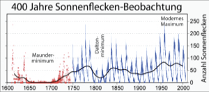Es ist nicht bekannt, wodurch diese Kälteperiode entstand. Die Vermutung ist, dass sie mit einem ungewöhnlichen Zeitabschnitt in der Geschichte der Sonne zusammenhängt, in dem die Astronomen eine ungewöhnlich geringe Zahl an Sonnenflecken beobachtet haben, Abb. 10. (Um Missverständnissen vorzubeugen sei hier betont, dass die Sonnenflecke nicht selbst Ursache, sondern nur ein Indikator für eine Änderung der Sonnenaktivität und damit der solaren Ausstrahlung sind; ausführlich behandelt in Abschnitt 3.2.2.2, Aktivitäten der Sonne).